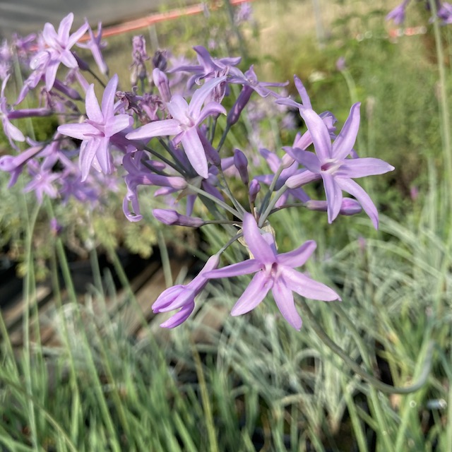 Tulbaghia violacea ‘Silver Lace’ est une variété ornementale d’ail d’Afrique du Sud, prisée pour son feuillage panaché vert argenté et ses fleurs mauves délicates qui ajoutent une touche élégante au jardin.