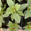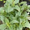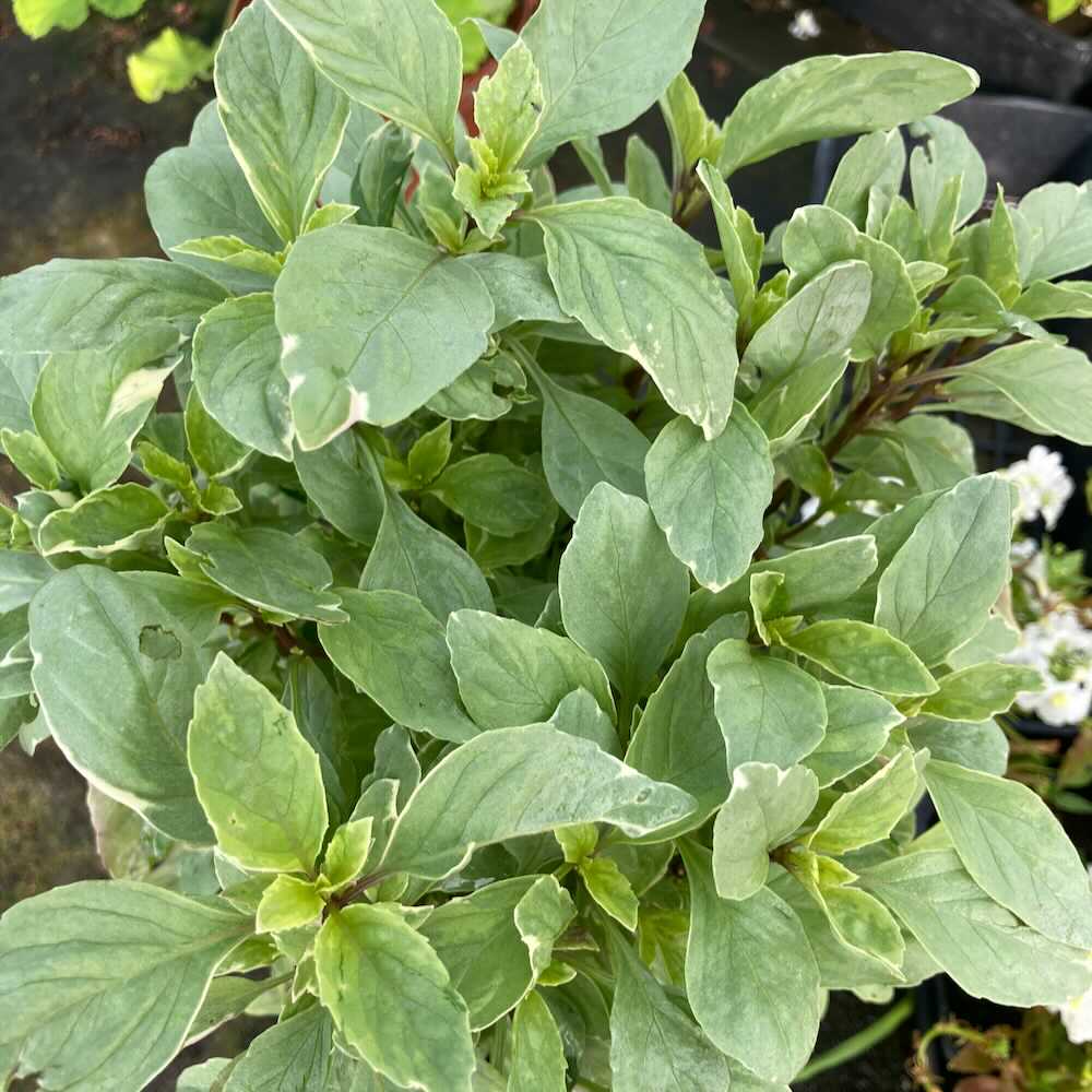 Le basilic ‘Pesto Perpetuo’ (Ocimum x citriodorum) est une variété unique de basilic vivace au feuillage vert bordé de blanc, dégageant un arôme intense de basilic citronné.
