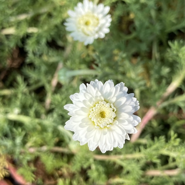 La camomille romaine à fleurs doubles (Chamaemelum nobile ‘Flore Pleno’) est une variété vivace, qui forme un tapis dont les fleurs se dressent sur leurs tiges.