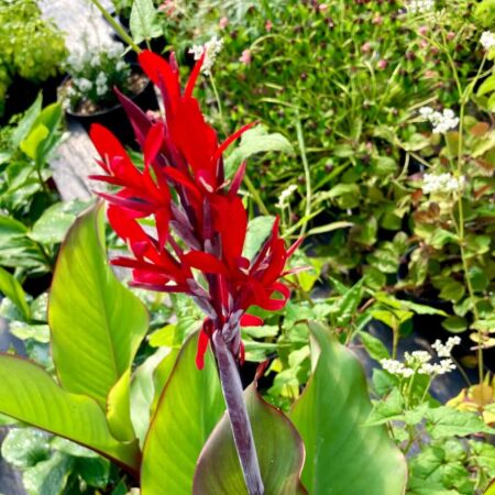 Le canna comestible, ou balisier rouge (Canna edulis), est une plante tropicale vivace aux grandes feuilles ornementales et aux fleurs rouge vif.