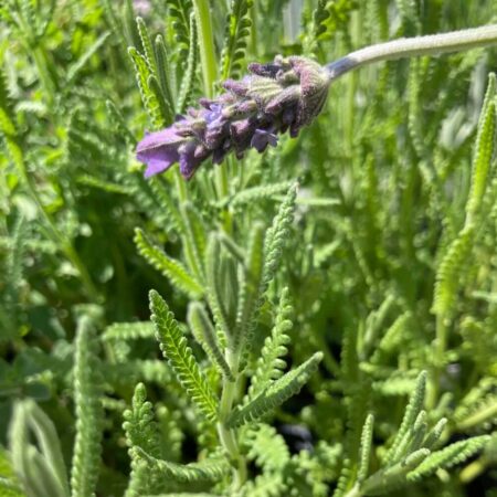 La lavande anglaise (Lavandula dentata) est une plante vivace ornementale et aromatique, reconnaissable à ses feuilles dentelées et ses épis de fleurs mauves délicatement parfumés.