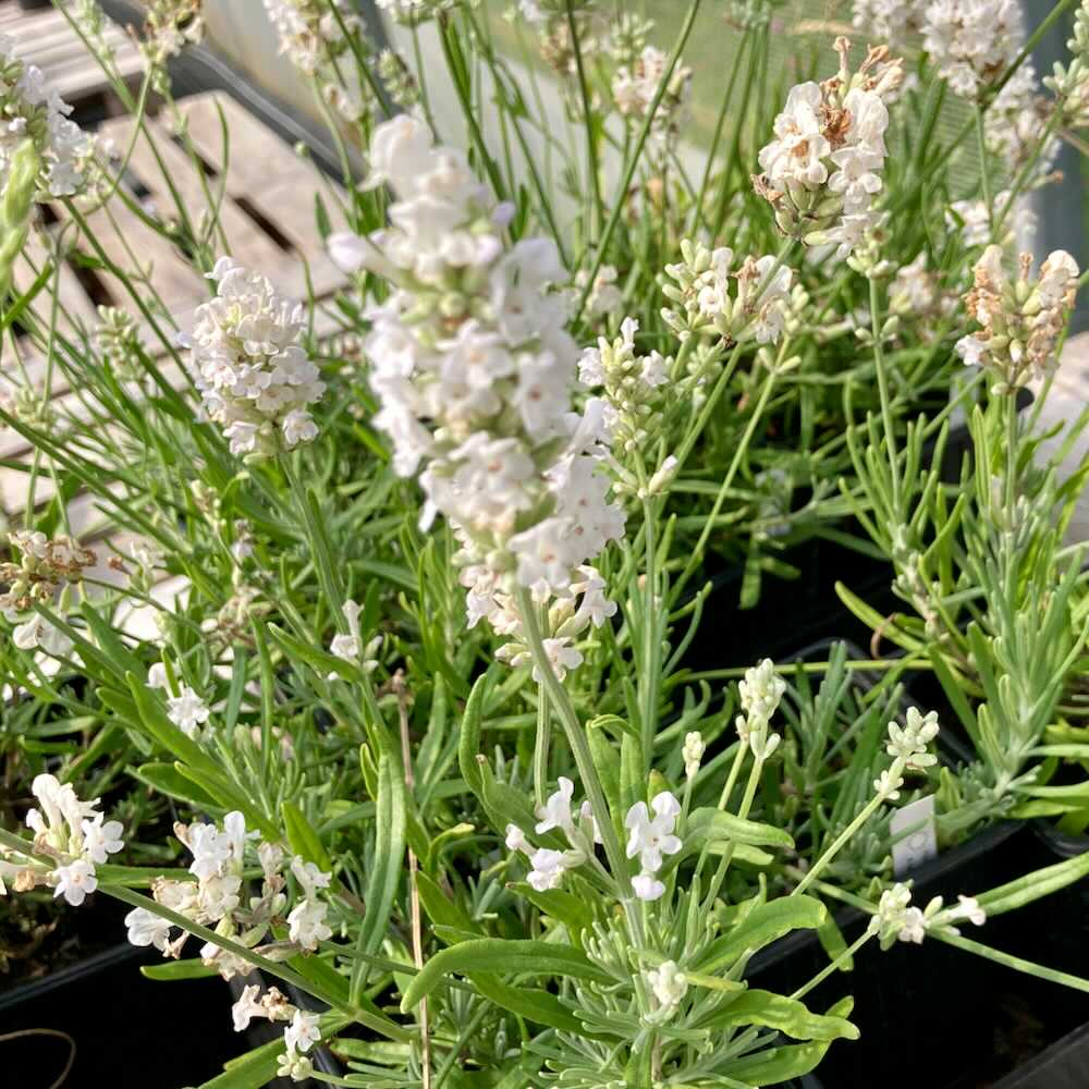 La lavande blanche (Lavandula angustifolia ‘Alba’) est une plante vivace ornementale, appréciée pour ses épis de fleurs blanches élégantes et son feuillage argenté aromatique.