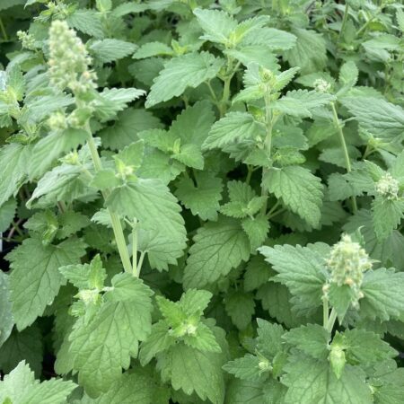 Nepeta cataria, aussi appelée herbe à chat, est une plante vivace aromatique originaire d’Europe et d’Asie occidentale. Elle forme des touffes souples au feuillage vert gris, légèrement velu et très odorant, et produit en été de nombreux épis de petites fleurs blanc crème ponctuées de mauve, très mellifères.