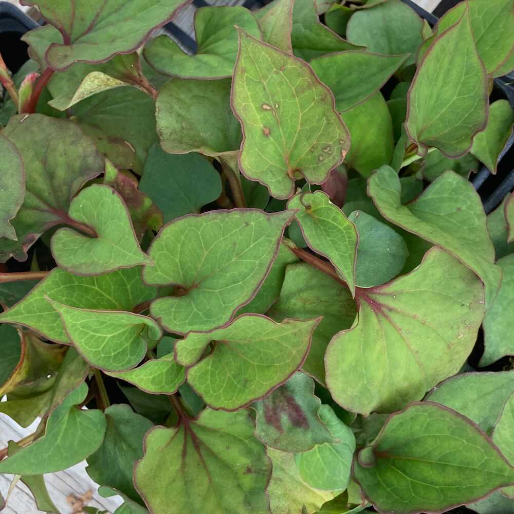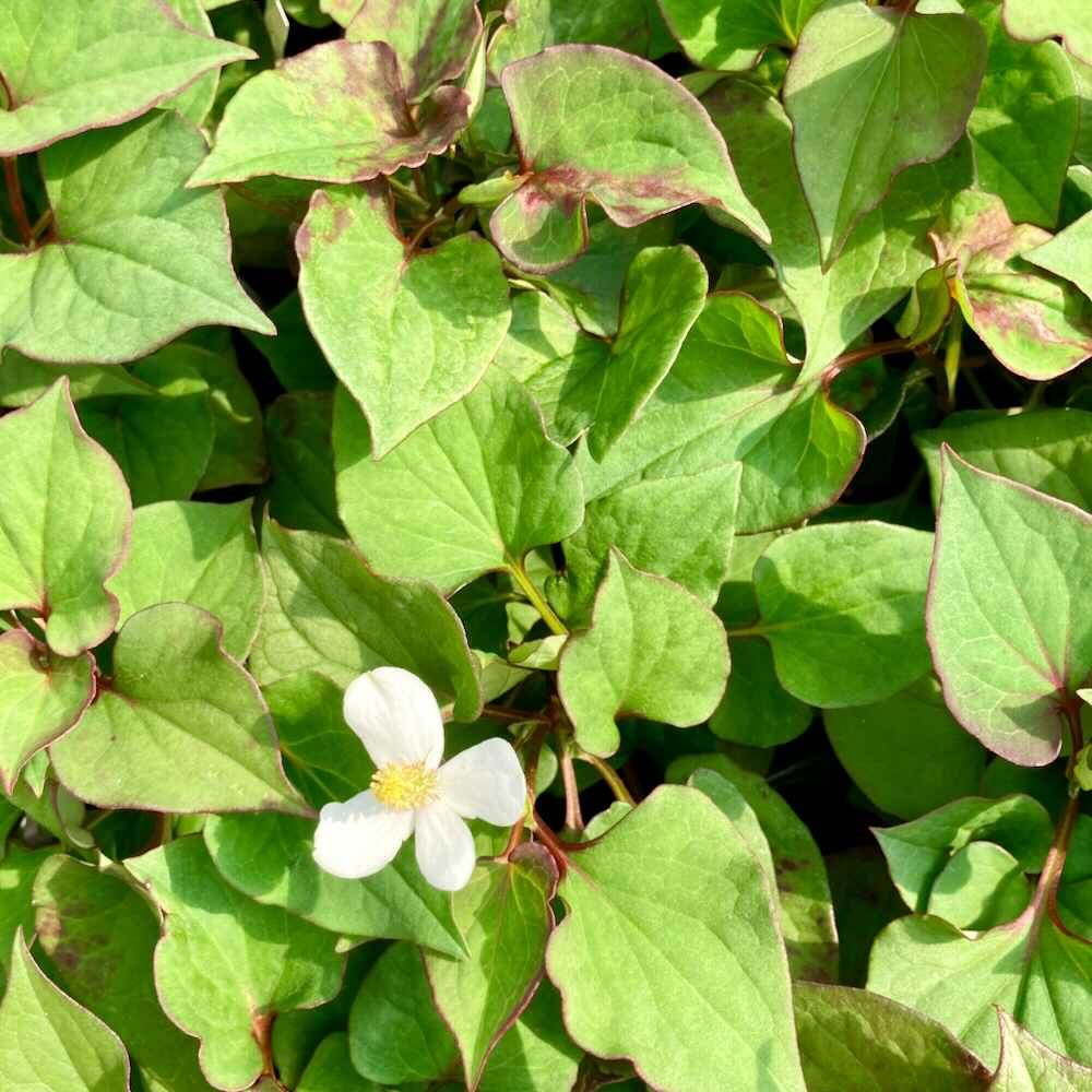 Le poivrier de Chine (Houttuynia cordata), aussi appelé plante caméléon, est une vivace aromatique au feuillage vert bordé de rouge et aux petites fleurs blanches en épis.
