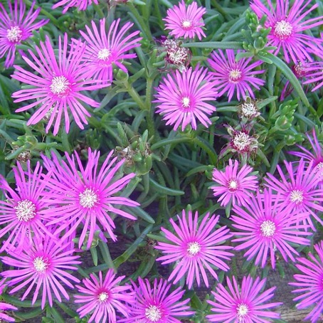 Le pourpier de Cooper violet (Delosperma cooperi) est une succulente rustique et tapissante aux fleurs violettes fuchsia éclatantes qui fleurissent abondamment tout l’été.