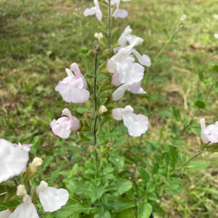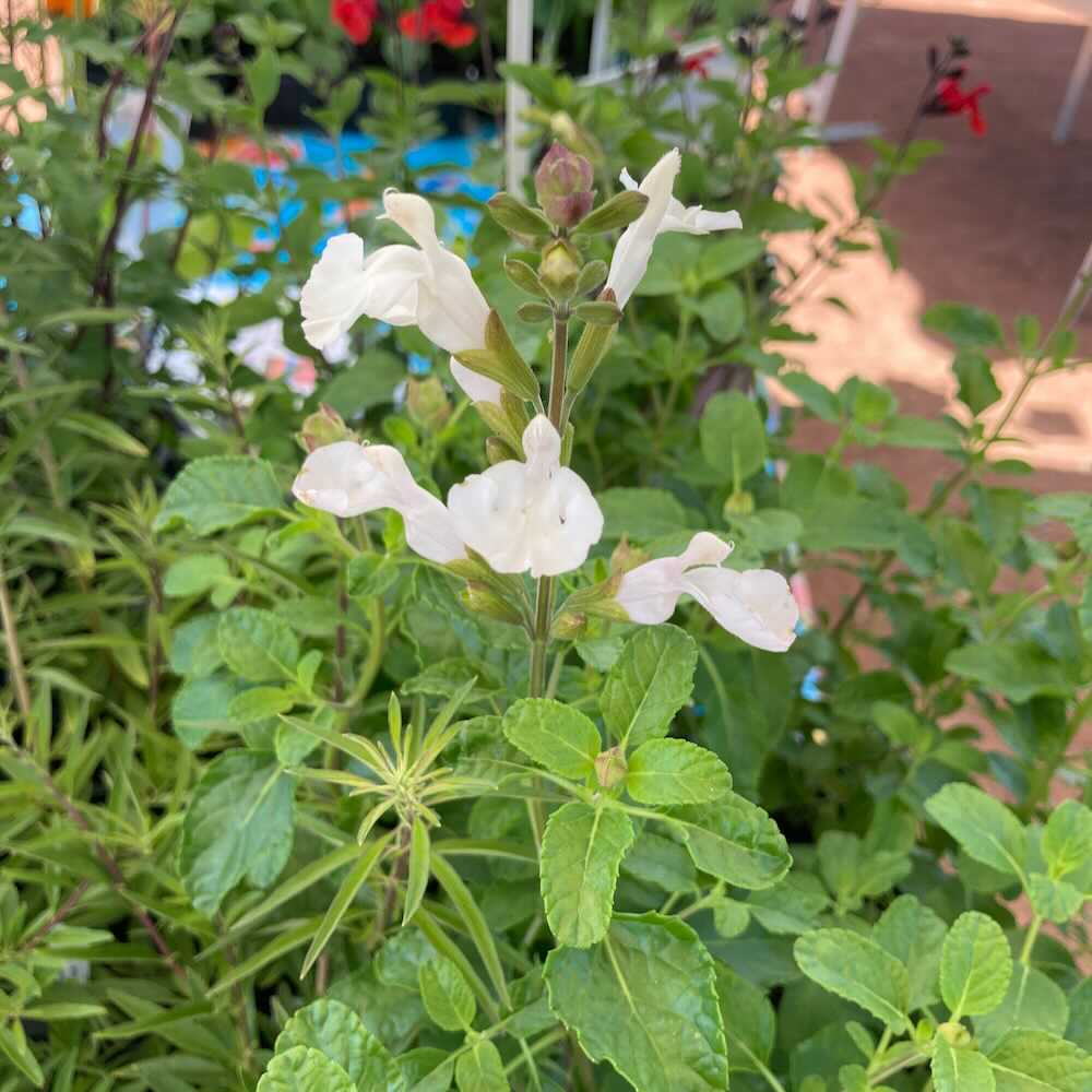 La sauge arbustive blanche (Salvia microphylla ‘Glacier’) est une vivace buissonnante au feuillage aromatique et aux fleurs blanc pur qui fleurissent abondamment du printemps à l’automne.