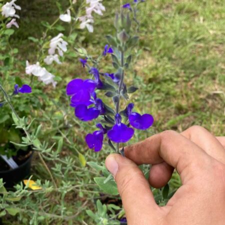 La sauge germandrée bleue (Salvia chamaedryoides) est une vivace buissonnante appréciée pour son feuillage gris-argenté et ses fleurs bleu intense qui fleurissent du printemps à l’automne.
